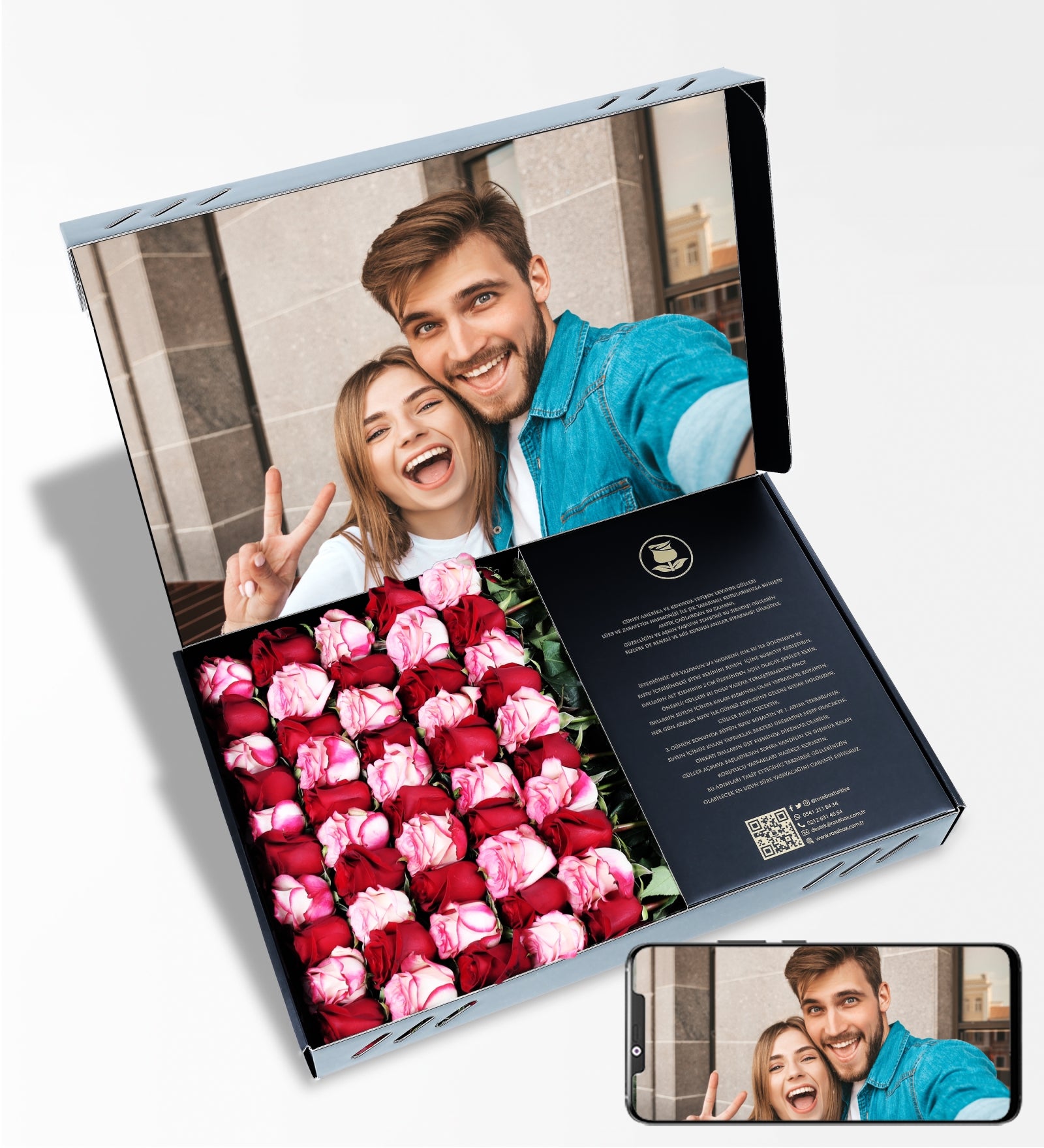 50 Kırmızı Gülden Fotoğraflı Gül Kutusu