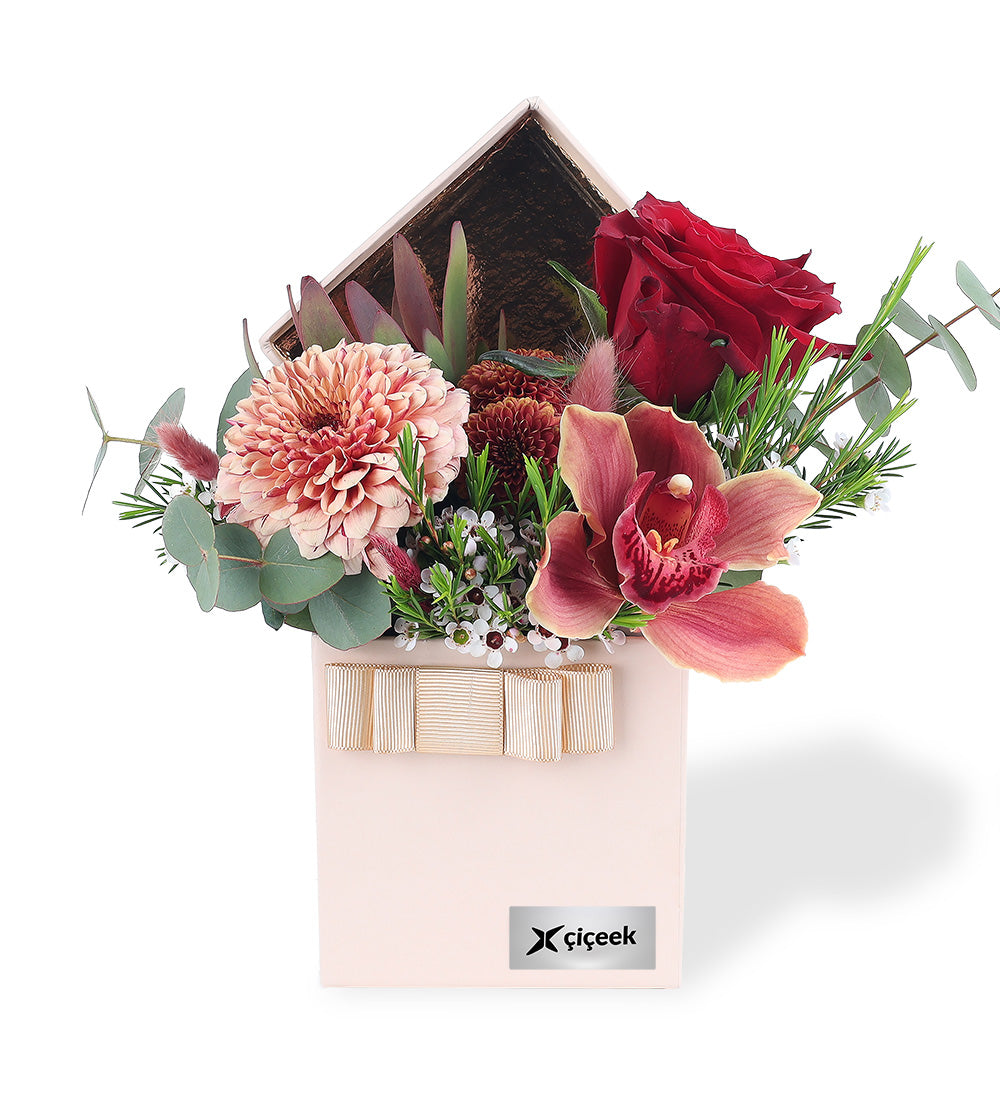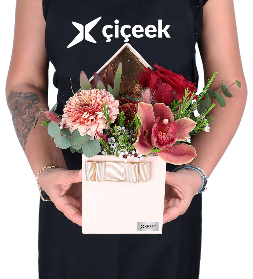 Sonbaharın en sıcak renkleri, modern bir sunumla buluştu. Şık bir bej kutu içerisinde, nostaljik Cappuccino Anastasia krizantemleri, asil orkide çiçekleri ve kadifemsi güllerin bir araya geldiği bu aranjman, son derece sofistike ve zevk sahibi bir hediye seçeneğidir.Sıcak ve Davetkar Bir Harmoni