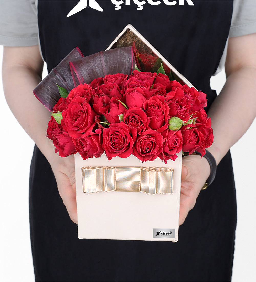 Büyük tekli güllerin aksine, çardak güllerin daha küçük ve çoklu yapısı, bu aranjmana daha samimi ve doğal bir hava katar. Kırmızının tutkusu, bej kutunun sakinliğiyle birleşerek dengeli ve modern bir romantizm sunar. İçten bir sevgi gösterisi için mükemmeldir.Her Anı Güzelleştiren Bir Hediye