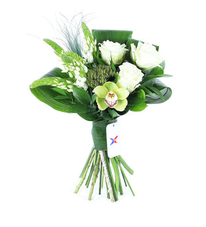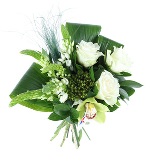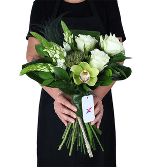 En taze beyaz güller ve en canlı orkide çiçekleri, siparişiniz üzerine usta çiçekçilerimiz tarafından özenle bir araya getirilir. Bu değerli buketin formunu ve tazeliğini koruyarak size veya sevdiklerinize ulaşması için titizlikle paketlenir.