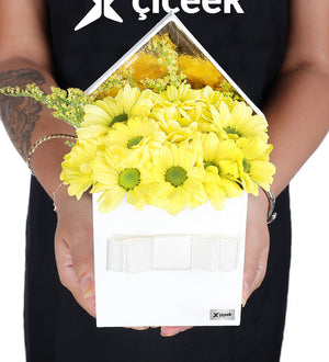 Sarı papatyaların o neşeli ve pozitif görüntüsü, beyaz kutunun temiz ve modern duruşuyla birleşerek iç ısıtan bir estetik yaratır. Bu aranjman, bir "geçmiş olsun" dileği, bir arkadaş tebriği veya sadece birinin gününe güneş gibi doğmak için mükemmeldir.Dostluğun ve Neşenin Sembolü