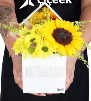 En kaliteli ve en canlı ayçiçekleri ile papatyalar, siparişiniz üzerine sizin için bir araya getirilir. Bu enerji dolu aranjmanın yolculuk boyunca formunu kaybetmemesi için özenle paketlenir ve en taze haliyle kapınıza kadar ulaştırılır.Beyaz Kutuda Sarı Papatya Ve Ayçiçeği Aranjmanı