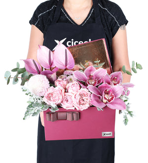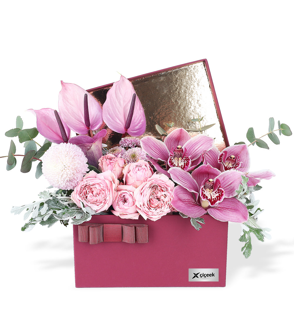 Modern çiçek sanatının en büyük ve en gösterişli hali... Büyük boy (XL) lüks bordo bir kutu içerisinde, cömertçe kullanılmış heykelsi Gala çiçekleri, parlak Antoryumlar ve romantik pembe güllerin yer aldığı bu aranjman, unutulmaz bir etki yaratmak için tasarlandı.Göz Alıcı Bir Sanat Eseri