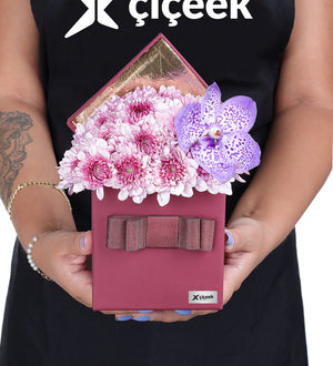 Sıradanlığın dışına çıkan, sanatsal bir buluşma! Pembe papatyaların neşeli masumiyeti, egzotik ve asil Vanda orkidenin çarpıcı güzelliğiyle lüks bordo bir kutu içinde bir araya geliyor. Bu aranjman, farklıyı ve güzellikteki kontrastı sevenler için yaratılmış bir tasarım harikasıdır.Masumiyet ve Lüksün Dansı