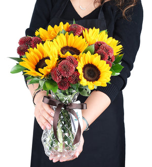 En taze ayçiçekleri ve en güzel biçme çiçekler, siparişiniz üzerine sizin için bir araya getirilir ve vazosuna yerleştirilir. Bu doğal güzelliğin formunu koruması için özenle paketlenir ve size veya sevdiklerinize en taze haliyle, güvenle ulaştırılır.