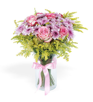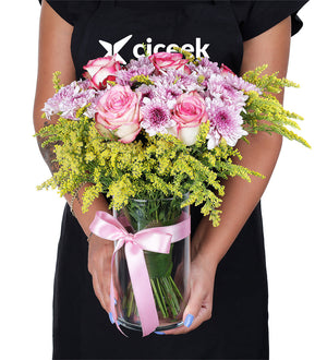 İçten bir gülümsemenin en güzel hali... Neşenin ve masumiyetin simgesi pembe papatyalar ile aşkın klasik çiçeği pembe güller, şık bir cam vazo içinde birleşerek sevgi dolu bir mesaj veriyor. Samimi, içten ve her zaman kalpleri ısıtan bir hediye.Tatlı Bir Renk ve Doku Uyumu