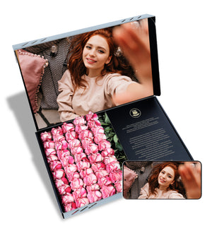 Sevdiklerinizin kalbine dokunacak, tamamen kişiselleştirilmiş ve unutulmaz bir hediye mi arıyorsunuz? O halde sevginin, minnettarlığın ve tatlılığın sembolü olan fotoğraf baskılı 50'li pembe gül aranjmanı tam size göre. Bu benzersiz kutu, özenle seçilmiş 50 adet taze pembe gül ile en kıymetli anılarınızı birleştiriyor. Yüksek kaliteli özel fotoğraf baskısı ile her bir gül yaprağı, özel bir kareyi taşıyarak bu kişiye özel pembe gül kutusu sıradan bir çiçekten çok daha fazlası haline getiriyor. Sevgiliye, anneye ya da çok değer verdiğiniz birine... Bu özel tasarım gül kutusu, duygularınızı en etkileyici ve kalıcı şekilde ifade edecek.
