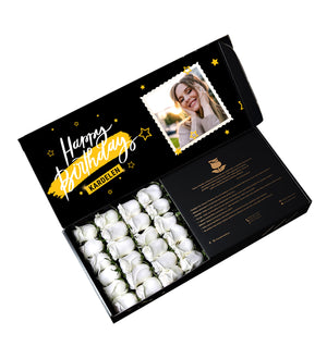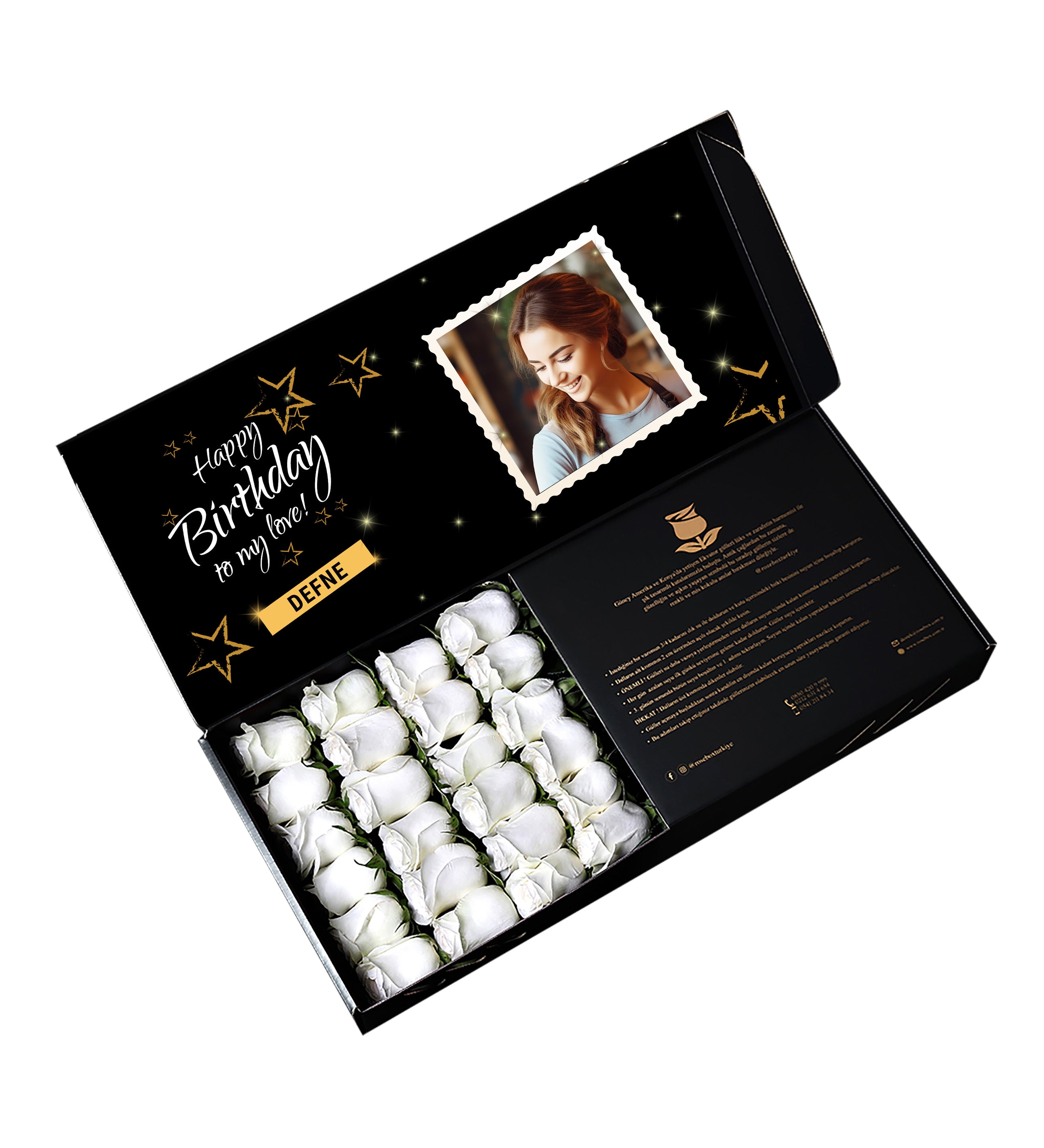 Hediyenizi sadece güzel bir çiçeğin ötesine taşıyan detay, fotoğraflı baskılı kutu konseptimizdir. "Happy Birthday" mesajı ve kutu üzerine UV baskı tekniğiyle işlenen en özel fotoğrafınız, bu hediyeyi tamamen kişiye özel bir hatıraya dönüştürür. Bu eşsiz gül kutusu, çiçekler solsa bile, paylaştığınız güzel anıları yaşatacak kalıcı bir dekoratif obje olacaktır. En özel anınızı beyaz gül zarafetiyle birleştirin.