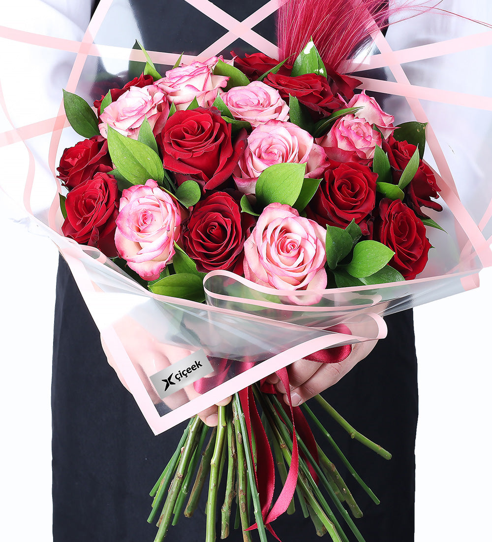 Bu gösterişli buketi hazırlamak için en kaliteli kırmızı ve pembe gülleri kullanıyoruz. Hacmini ve güzelliğini koruyacak şekilde paketleyerek, bu unutulmaz hediyenin kapınıza kadar ilk anki tazeliğiyle gelmesini sağlıyoruz.