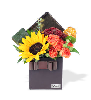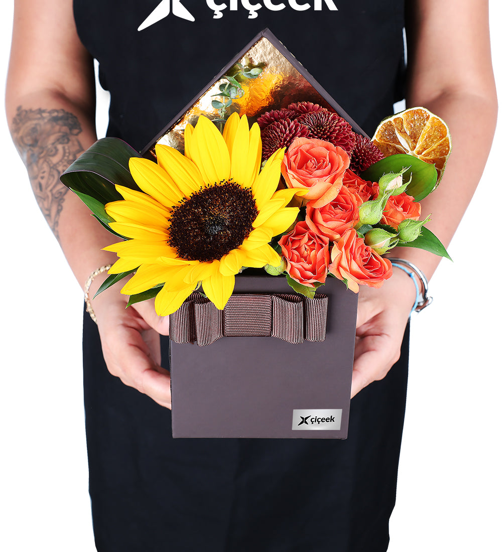 Güneşin neşesi ve sonbaharın sıcaklığı bu şık kutuda buluştu! Mutluluğun sembolü capcanlı ayçiçekleri ve enerjik turuncu çardak gülleri, rustik bir kahverengi kutu içinde sunularak samimi ve içten bir hediye alternatifi oluşturuyor. Doğallığı ve sıcak renkleri sevenler için mükemmel bir seçim.Doğal ve Samimi Bir Güzellik