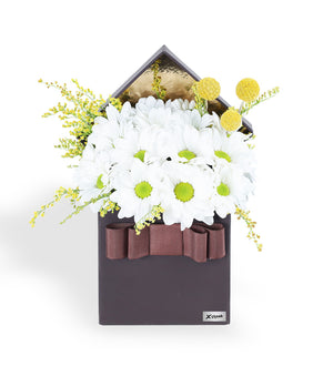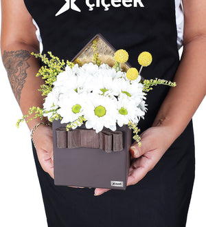 Masumiyetin ve yeni başlangıçların en sevilen çiçeği papatya, şimdi en doğal haliyle karşınızda. Rustik ve şık bir kahverengi kutu içinde sunulan dolgun bir beyaz papatya aranjmanı, sadeliğin ne kadar etkileyici olabileceğinin en güzel kanıtıdır. İçten, samimi ve her duruma uygun bir hediye.Sade ve Huzur Dolu Bir Güzellik