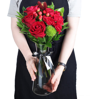 Bu aranjman, kırmızının farklı doku ve formlarını bir araya getirerek zengin bir görsel şölen sunar. Çardak güllerin doğal ve dolgun yapısı, Ekvator güllerinin klasik ve kusursuz formuyla birleşerek, sevginizin ne kadar çok yönlü ve derin olduğunu anlatır.Tutkunun En Güzel Hali