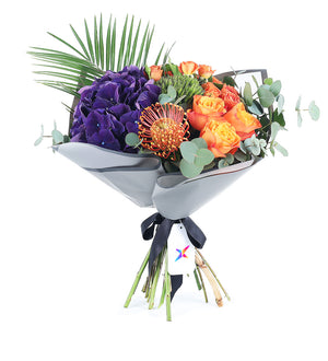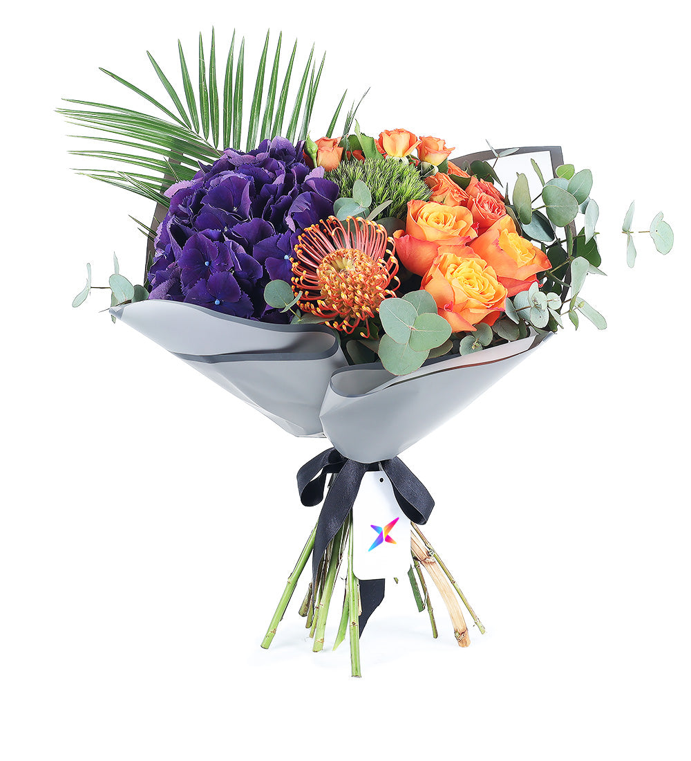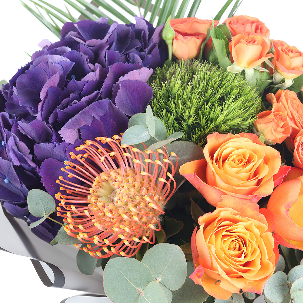 En taze mor ortancalar ve en canlı turuncu güller, usta tasarımcılarımız tarafından estetik bir dengeyle bir araya getirilir. Bu özel buketin formunu ve tazeliğini koruyarak size veya sevdiklerinize ulaşması için özenle paketlenir.