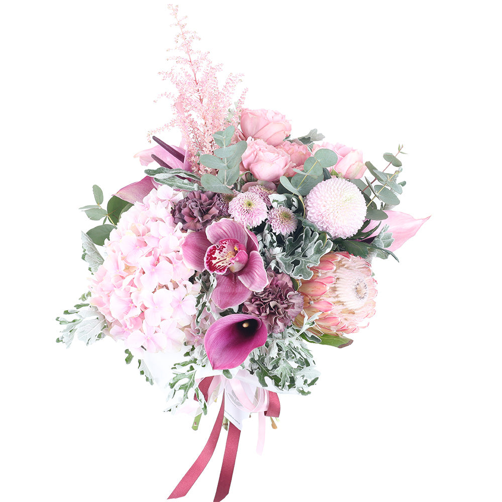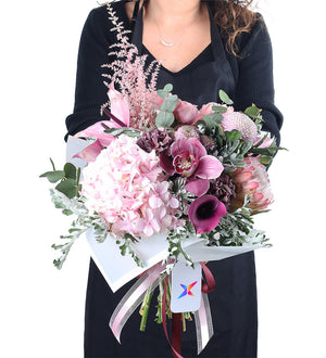 Bu buket, zıtlıkların uyumundan doğan bir güzellik sunar. Protea'nın dokulu yapısı, Gala'nın pürüzsüz hatları, Orkide'nin egzotik formu ve Ortanca'nın bulutsu dolgunluğu, pembenin en güzel tonlarıyla birleşerek dinamik ve ilgi çekici bir kompozisyon oluşturur.Yaratıcılığı ve Aşkı Kutlayın