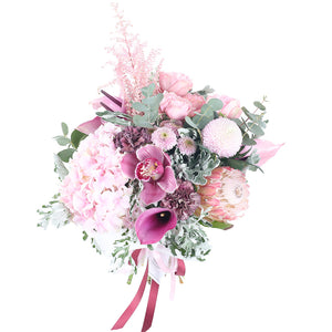 Sıra dışı formlar ve romantik renklerin en güzel buluşması... Heykelsi Pembe Gala, egzotik Protea, asil Orkide ve dolgun Ortancaların bir araya geldiği bu buket, stil sahibi ve cesur ruhlar için tasarlanmış bir sanat eseridir.Dokuların ve Formların Büyüleyici Dansı