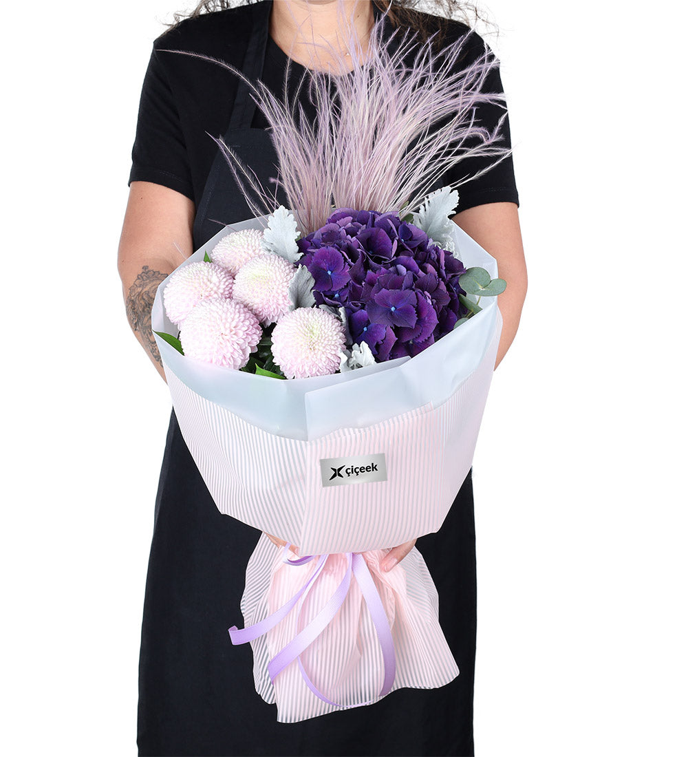 Modayı takip eden, stil sahibi bir hediye arayanlar için... Pembenin en tatlı tonlarındaki dolgun Anastasia krizantemleri, morun asil rengini taşıyan bulutsu ortancalarla bir araya gelerek son derece trend ve göz alıcı bir buket oluşturuyor. Hem modern hem de romantik bir seçim.Beklenmedik Renklerin Uyumu