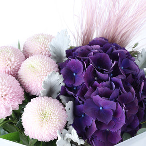 En taze pembe anastasyalar ve en canlı mor ortancalar, usta tasarımcılarımız tarafından estetik bir dengeyle bir araya getirilir. Bu özel buketin formunu ve tazeliğini koruyarak size veya sevdiklerinize ulaşması için özenle paketlenir.