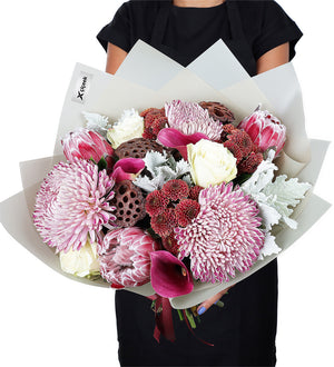 Sanatsal ifadenin gücünü bir üst seviyeye taşıyın. Egzotik Protea, katmerli Anastasya, modern Gala ve mistik Lotus çiçeklerinin daha cömert bir kullanımıyla hazırlanan bu L boy buket, standart boyutun etkisini katlayarak sunuyor. Büyük bir kutlamayı taçlandırmak veya daha güçlü bir mesaj vermek için idealdir.Göz Dolduran Bir Kompozisyon
