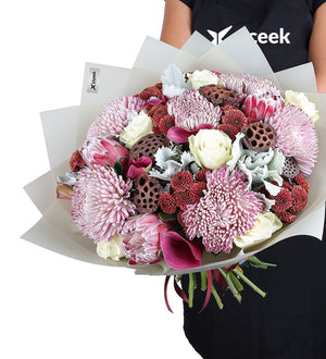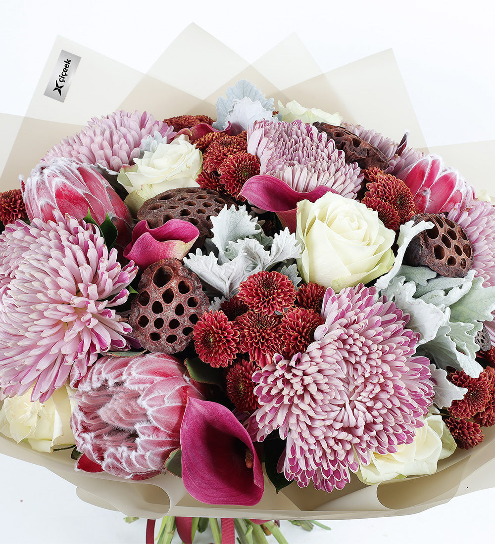 Kelimelerin yetersiz kaldığı anlar için tasarlanmış, nefes kesici bir şaheser. Egzotik Protea, Anastasya, Gala ve Lotus çiçeklerinin en dolgun ve en gösterişli halleriyle hazırlandığı bu devasa XL buket, en büyük kutlamaların ve en unutulmaz anların vazgeçilmezidir. Bu, bir buketten çok daha fazlası, yaşayan bir sanat eseridir.Nefes Kesen Bir Görsel Şölen