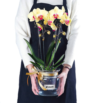 Cascade orkidelerin aşağı doğru zarifçe sarkması, onlara standart orkidelerden çok daha hareketli ve etkileyici bir görünüm kazandırır. Sarının neşeli tonlarıyla birleşen bu yapı, onu gerçek bir odak noktası haline getirir.