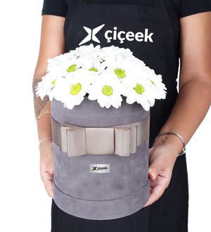 Sadeliğin en şık haliyle tanışın! Masumiyetin ve yeni başlangıçların en sevilen çiçeği beyaz papatyalar, şimdi modern ve sofistike bir yuvarlak gri kadife kutu içinde sunuluyor. Bu aranjman, sadeliğin ne kadar etkileyici olabileceğini kanıtlayan, stil sahibi bir hediye.Sade ve Huzur Dolu Bir Güzellik